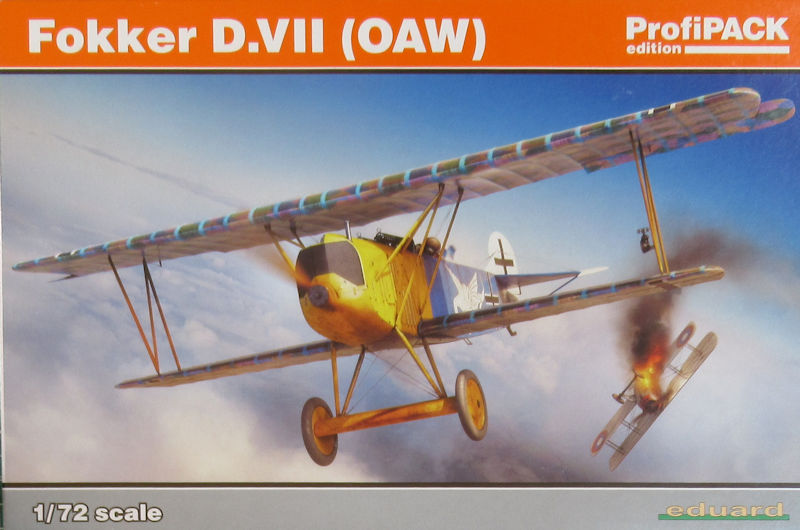 Bausatz: Auf der diesjährigen Pressekonferenz von eduard in Nürnberg auf der Spielwarenmesse gab es für alle Teilnehmer einen neuen Bausatz der Fokker D. VII (OAW) in 1/72. Inzwischen ist der ProfiPACK erschienen. So befinden sich im praktischen Stülpkarton vier dunkelgraue Spritzlinge mit 102(!) Einzelteilen, ein Fotoätzteilbogen, gelbe Masken, zwei Decalbögen und eine mehrfarbige Bauanleitung. Eine Vielzahl der Bauteile ist für andere Varianten bestimmt und wandern beim Bau der OAW-Fokker in die Restekiste.