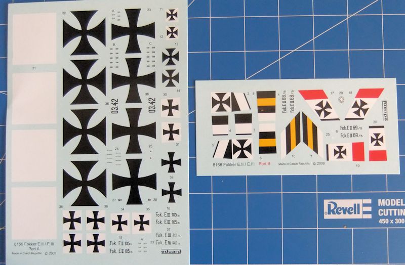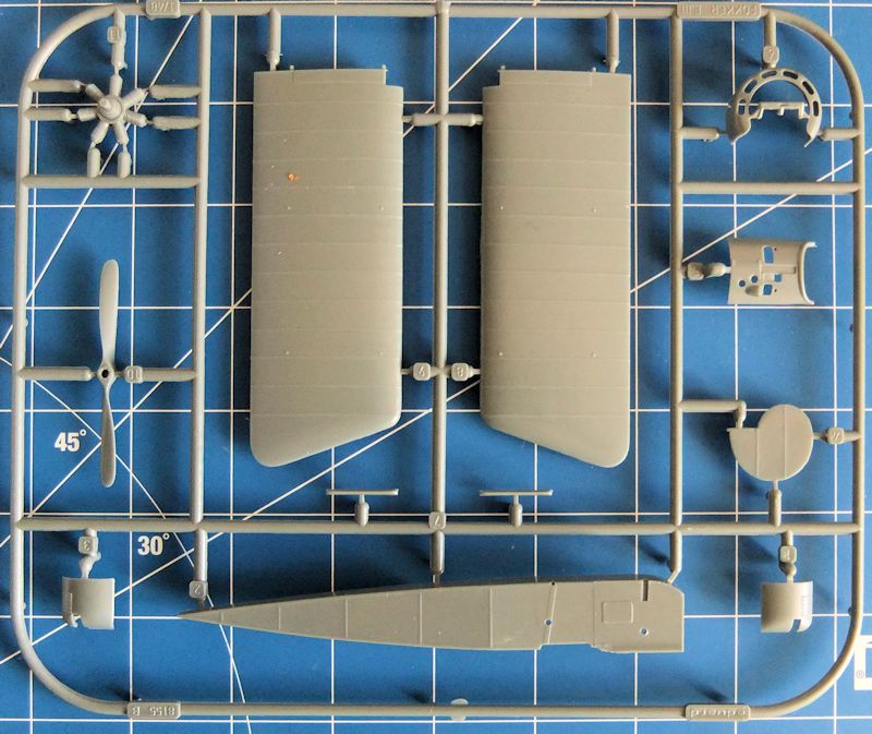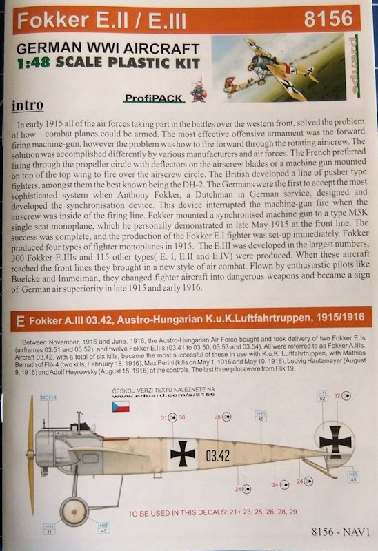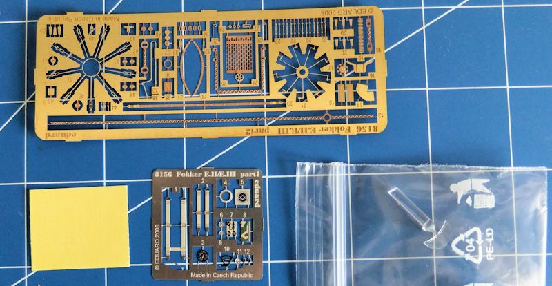 Aus 80 superfein abgegossenen Bauteilen aus dunkelgrauem Kunststoff kann mit noch einmal so vielen Teilen aus Messing eine museumsreifen Replik des Originals aus der Anfangszeit des ersten Weltkrieges hergestellt werden. Die super Bauanleitung erläutert jeden Schritt detailliert. Und wer mit den vielen Messingteilen, welche größte Aufmerksamkeit und Erfahrung erfordern, nicht so recht klar kommt, dem ist auch die Möglichkeit gegeben, schon aus den Grundbauteilen ein angemessenes Modell zu bauen. Viele der Ätzteile sind übrigens schon farbig gestaltet. Noch weiter auf die Qualität des Bausatzes einzugehen, hieße "Eulen nach Athen tragen." Für E.II bzw. E.III liegen unterschiedliche Rahmen bei. Die Fokker E.II unterschied sich von den anderen Maschinen ins besondere durch die perforierte Motorverkleidung. Bei der E.III ist es u.a. Oberursel neunzylinder Sternmotor.