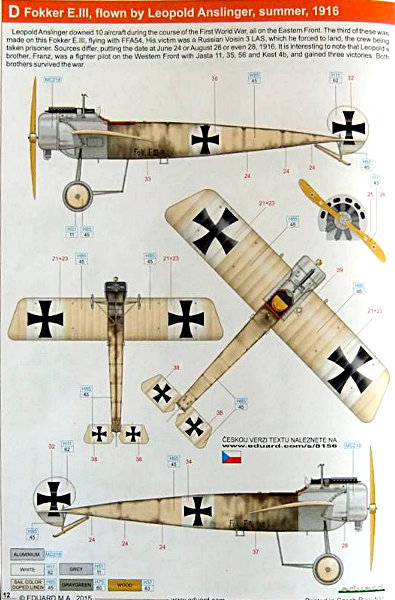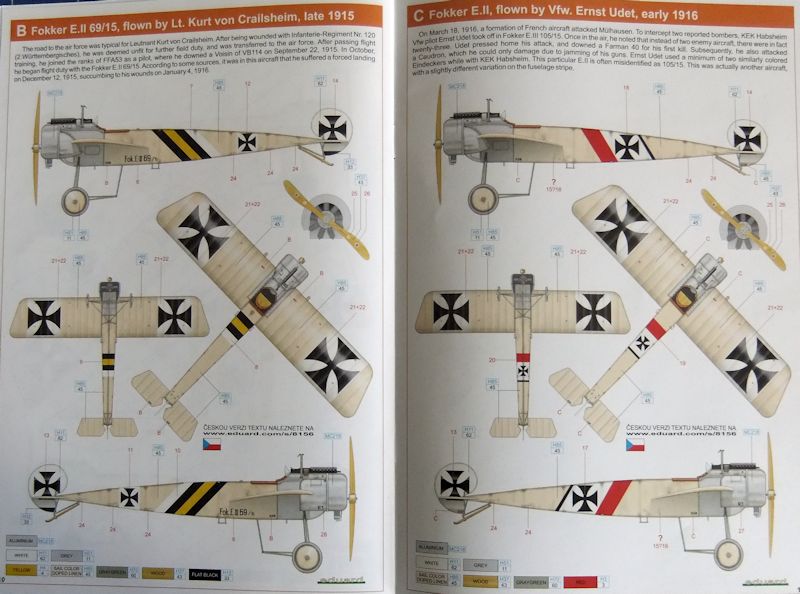 Bemalung: Alle Maschinen bekommen einen Anstrich in einem beigen Leinentuchton. Nur der vordere Rumpfabschnitt wird in Naturmetall gehalten. Die Originale waren anfangs übrigens gepunzt. Das bedeutete, die runde Form wurde mühsam durch speziell ausgebildete Metallhandwerker mit einem dafür geschmiedeten Hämmerchen geformt. Vorgesehen sind je zwei Maschinen E-II bzw. E-III.