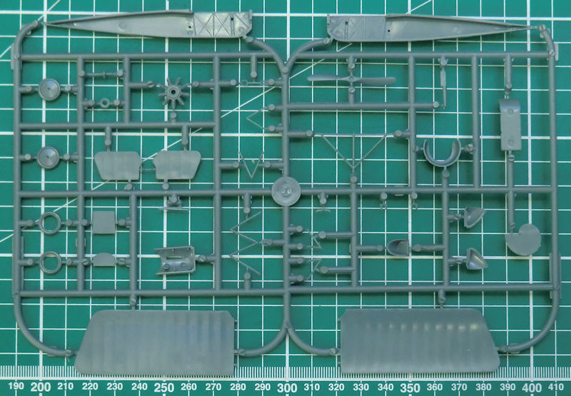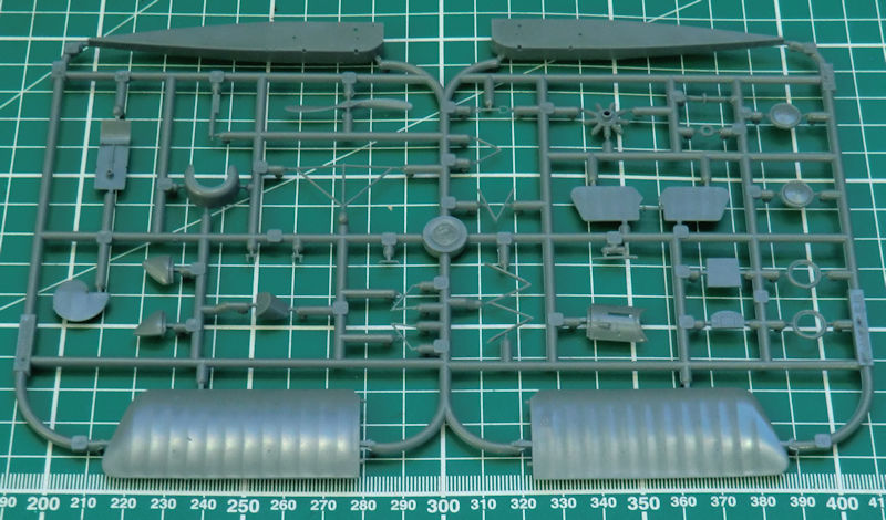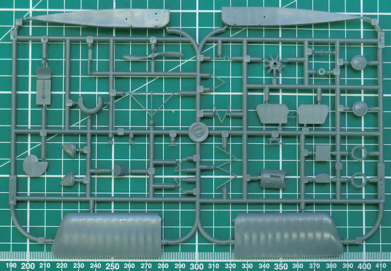 Der Spritzling enthält 35 Einzelteile. Diese sind sauber abgespritzt. Im Gegensatz zum Airfix-Bausatz besteht der Rumpf aus zwei Hälften. Leider ist dadurch die charakteristische Naht auf der Rumpfunterseite nicht vorhanden.