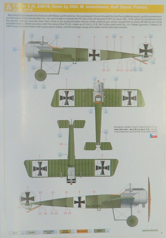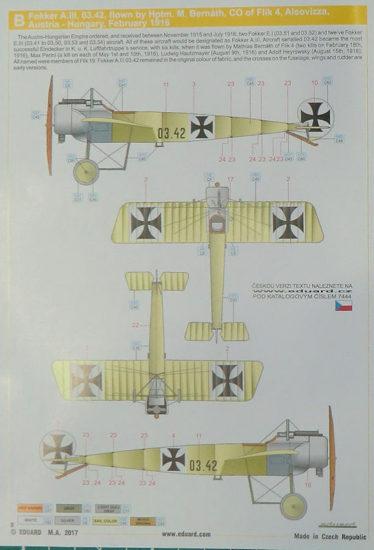 Vorbild: Die Fokker E.III entstand bei Fokker in Schwerin als Weiterentwicklung der E II, von der sie sich kaum unterschied. Der wesentliche Unterschied bestand in einem vergrößerten Tank. Den Ursprung hatten beide Typen in der Fokker A.III und E.I. Letztere war das erste mit einem synchronisierten MG ausgerüstete Jagdflugzeug. Es hatte am 19. oder 20. Mai 1915 seinen Erstflug mit Fokker.