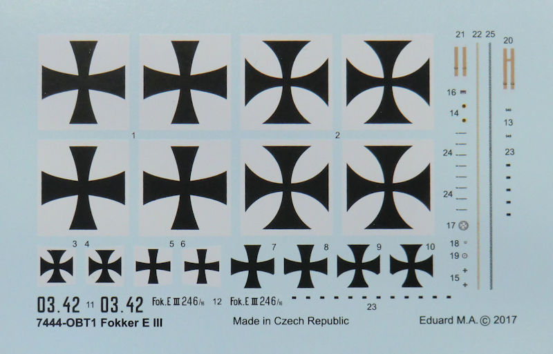 Bausatz: Bei eduard erscheint die Fokker E.III immer wieder in verschiedenen Ausführungen. Selbst bei Smer gab es diesen Bausatz schon. Dieses Mal ist es eine WEEKEND Edition. In dem stabilen Stülpkarton befinden sich gut verpackt ein dunkelgrauer Spritzling, ein Decalbogen und die mehrfarbige Bau- und Bemalungsanleitung.