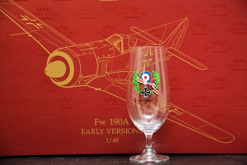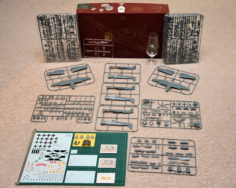 Bausatz: Im Karton liegen zwei vollständige Bausätze, aus denen man eine Fw 190 A-2 oder A-3 und eine frühere oder spätere Version der Fw 190 A-4 bauen kann. Dazu kommen Teile aus der "eduard" Brassin-Serie (vier Räder, Fahrwerkrestabdeckung, eine Motorhaube mit Sandfilter), zwei Fotoätzteile für das Cockpit (Fw 190 A-3 und A-4) und ein Großer DIN A4 Abziehbilderbogen von Cartograph, sowie zwei kleinere Decal Bögen. Für Spritzarbeiten liegt Maskierfilm bei. Der Royal Class entsprechend enthält der Karton ein DIN A3 Poster und ein Bierglas mit Motiv.