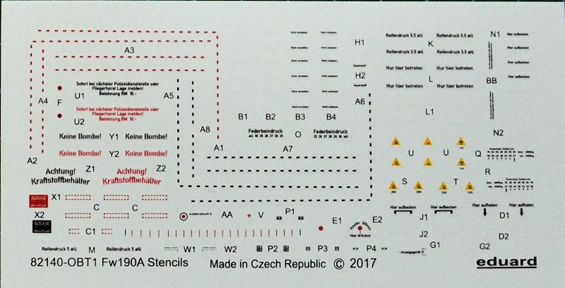 Die Farbangaben beziehen sich wie immer auf die Sortimente von Gunze. Für die Platzierung der Wartungshinweise gibt es eine Extraseite mit Hinweisen, dito für die Lackiermasken. Es gibt zwei weitere Bögen mit sämtlichen Wartungs- und Warnhinweisen. Die Qualität ist nicht ganz so gut wie die des Hauptbogens, die Kantenschärfe ist etwas schlechter und Oktanangabeschilder haben leichten Versatz.