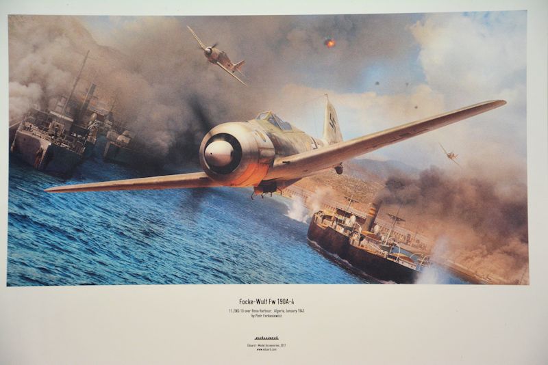 Vorbild: Über die Geschichte der Focke-Wulf 190 gibt es wohl nicht mehr viel Neues zu berichten. Die hier vorgestellte Version A-2 bis A-4 unterscheiden sich nur in Kleinigkeiten vom Vorgänger, vieles im Inneren. Die Standardbewaffnung bestand aus zwei 7,92 mm MG im Rumpf, zwei MG 151/20 Kanonen in den Flügelwurzeln sowie optionale 20 mm MG FF-Kanonen in den äußeren Flügeln. Auch etablierten sich weitere Umbau- und Rüstsätze, damit die Maschinen ihren immer weiter gefassten Einsatzanforderungen besser entsprechen konnten. Hierzu zählten Bombenschlösser, Nachtjagdausrüstung und Kameras zur Fotoaufklärung.