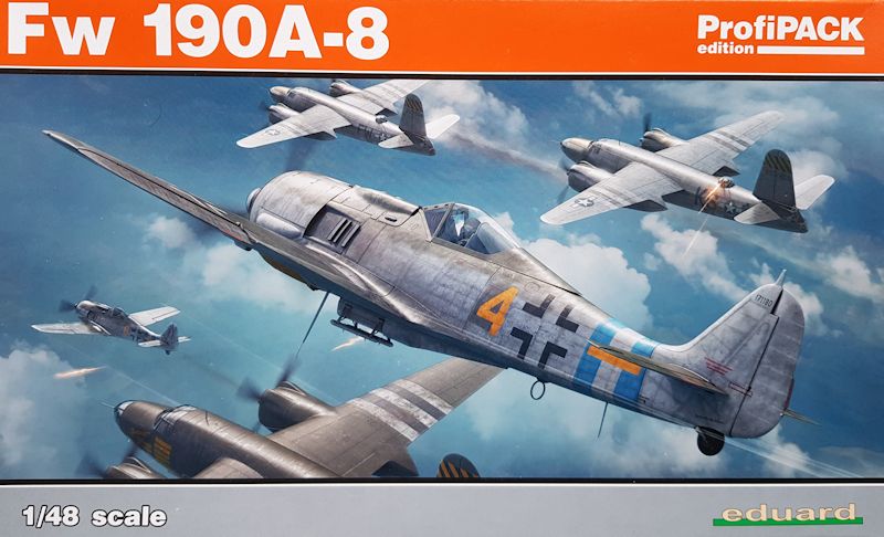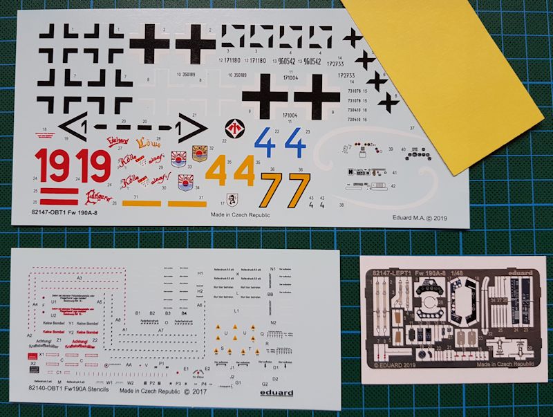 Bausatz: Nach dem Auspacken des wunderschön gestalteten Kartons hält der Modellbauer fünf Spritzlinge aus grauem Kunststoff, einen weiteren - selbstverständlich schlierenfreien - Spritzling mit Klarsichtteilen, eine Ätzplatine, eine Lackierschablone für Kanzel und Reifen sowie Abziehbilder und eine 16-seitige Bauanleitung in der Hand. Die Qualität der Plastikteile ist dabei EDUARD-typisch: scharfe und - wenn nötig - dünne Kanten, schöne Gravuren und nur minimaler Bedarf an Nachbearbeitung, da u.a. die Angüsse klug gesetzt sind. Die für die Version A-8 typischen Änderungen am Rumpf zu den Tragflächen sind meines Erachtens stimmig umgesetzt. Nichtsdestotrotz kann ich jedem nur empfehlen, zusätzlich noch einmal ca. 50 € für das unten genannte Buch von Peter Rodeike in die Hand zu nehmen. Die dort enthaltenen Risszeichnungen sind mit einer Masse an Vorbildfotos hinterlegt, wohingegen oftmals sehr professionell wirkende Profilbilder im Netz oder in Zeitschriften Zugangsklappen zeigen, wo nie welche waren. Bei den EDUARD-Fw 190 hat sich beispielsweise eine solche Klappe auf der linken Rumpfseite hinter den Abgasdüsen eingeschlichen, die allerdings mit wenig Aufwand unter Spachtel verschwinden kann.