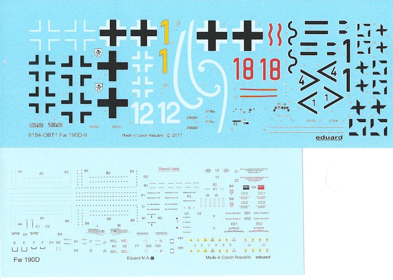 Es liegen ein neu gestalteter umfangreicher Abziehbilderbogen mit Markierungen für 5 unterschiedliche Flugzeuge sowie ein kleinerer Bogen mit generellen Beschriftungen und Warnhinweisen bei: