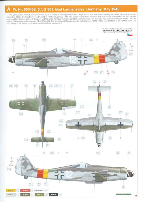 Bauplan/ Bemalung: Als Bauplan erhält man ein farbiges 16 seitiges Heft in DIN A4, das durch den Bauprozess führt. Die Abbildungen sind sehr übersichtlich und verständlich. Die Angaben zur Bemalung einzelner Teile finden sich in jedem Bauabschnitt sowie für das gesamte Flugzeug auf den vier letzten Seiten. Für die Auswahl der passenden Farben findet man die originalen RLM Bezeichnungen sowie Kodierungen von Humbrol und Modelmaster.