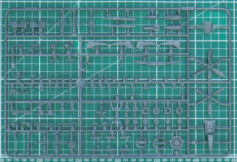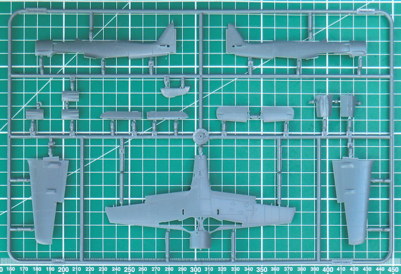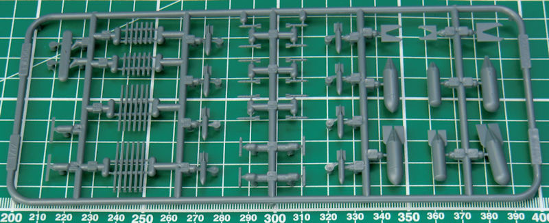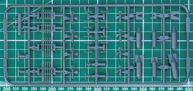 Das Höhenleitwerk besteht aus linker und rechter Hälfte. Die Querruder und auch das Seitenruder liegen einzeln bei. Dadurch gibt es sehr scharfe Hinterkanten. Die beiden Hauptfahrwerksräder bestehen aus drei Teilen. Bei den Felgen gibt es Alternativteile. Die beiden Hauptfahrwerksbeine besitzen anmodellierte Fahrwerksscheren. Die Hauptfahrwerksklappen besitzen eine ordentliche Form und von innen schöne Details. Die Abwurfwaffen sehen in der Kiste schon ordentlich aus und die Bomben haben schöne dünne Leitflossen.
