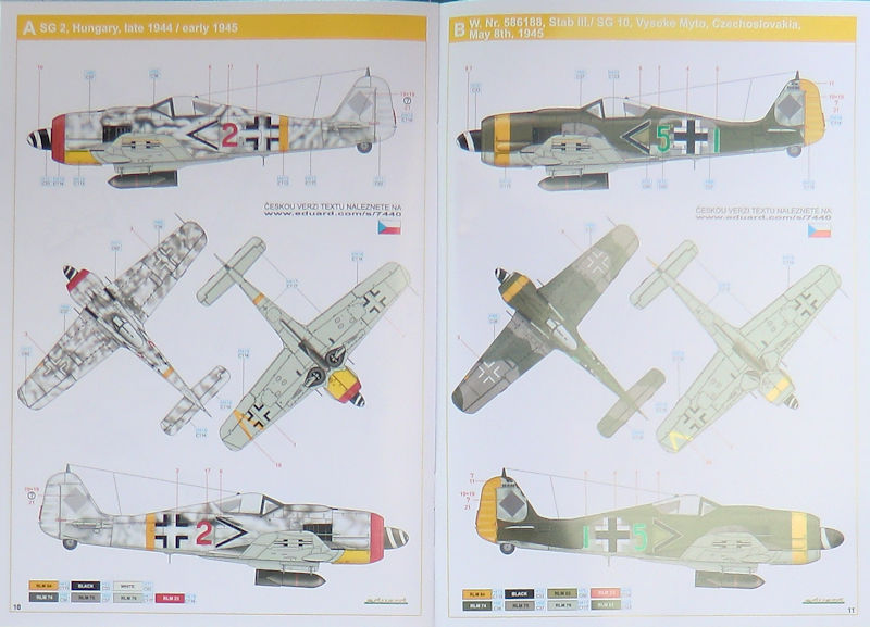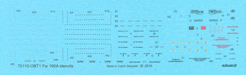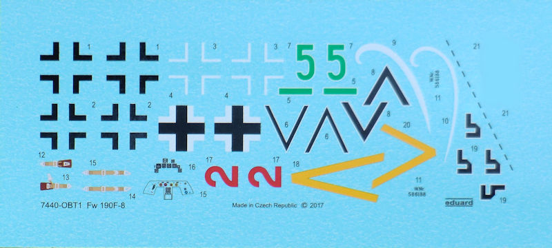 Bei den Farbangaben bezieht man sich auf RLM Farbtöne und weiterhin auf das Farbsystem von GUNZE. Die beiden Decals sind tadellos auf hellblauem Trägerpapier bei Eduard gedruckt worden. Es gibt auch sehr viele kleine Wartungshinweise sowie Decals für die Spinnerspiralen.