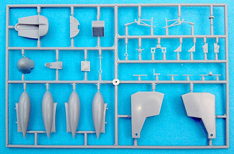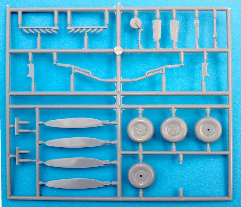 Bei diesem Bausatz handelt es sich um ein typisches Short-Run-Produkt. Er ist schon einige Jahre auf dem Markt, aber unser Webmaster bat mich dennoch, ihn einmal zu beschreiben, nicht zuletzt in Hinblick auf eine dem Vernehmen nach für dieses Jahr geplante Neuauflage. Die vier hellgrauen Spritzrahmen enthalten 64 sauber und gratfrei abgespritzte Teile ohne Passzapfen und mit stiftförmigen Aufsätzen im Bereich der Auswurfstellen. Die Teile sind sehr glatt und mit feinen, recht flachen Gravuren versehen. Auch manche Details fallen zu flach, fast zweidimensional aus.