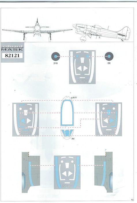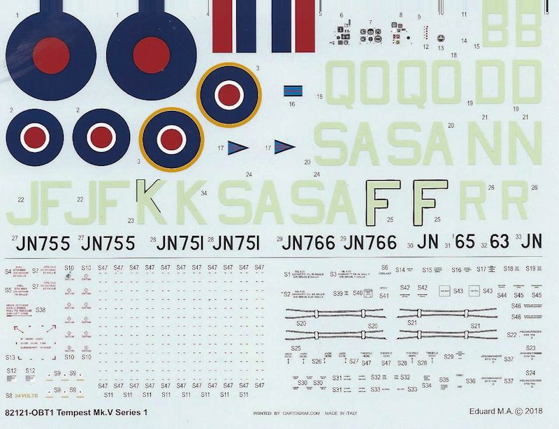 Der von Eduard selbst gedruckte Decalbogen bietet fünf Versionen und widmet sich bei zweien von ihnen dem britischen Ass Roland Beamont, dessen Maschine einmal mit und einmal ohne Invasionsstreifen gebaut werden kann: