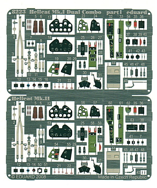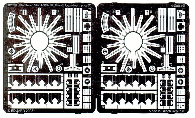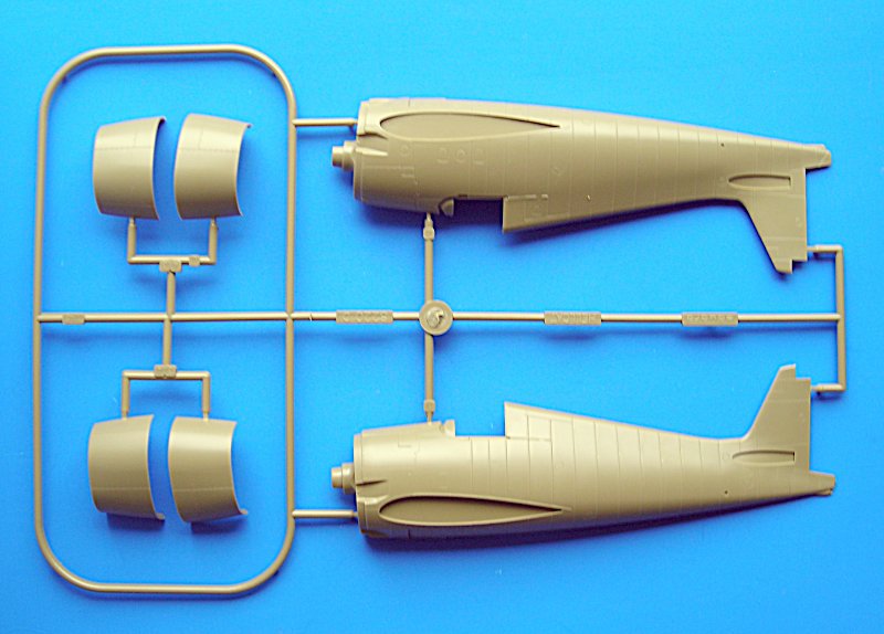 Nun zum Inhalt. Wie zu vermuten war, liegen die bekannten Plastikteile für die F6F-3 bei. Weiterhin gibt es einen zweiten Bausatz, dem neue Rümpfe. Für das Cockpit gibt es jetzt etwas mehr Ätzteile, was ein Fortschritt ist, da Eduard hier doch etwas zu sparsam war. Natürlich liegt für jede Version ein eigener Bogen bei, der die Unterschiede berücksichtigt. Ergo kann man eine F6F-3 und eine F6F-5 aus der Schachtel bauen bzw. deren britische Pendants.