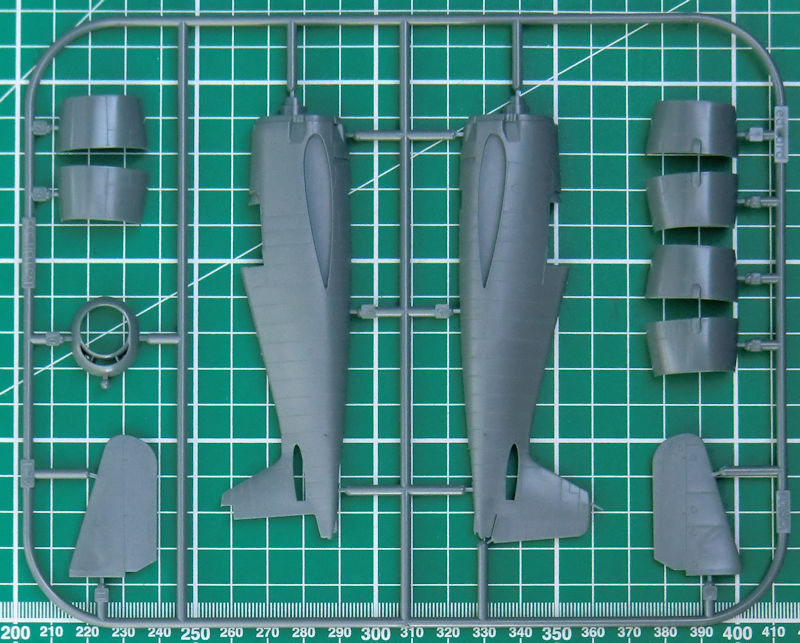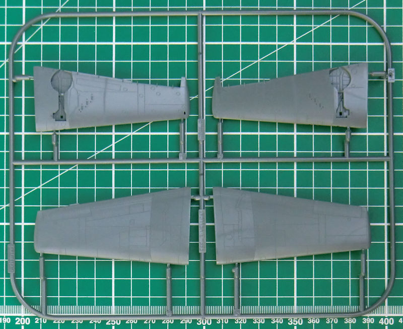 Die Fahrwerksschächte befinden sich in den Tragflächenunterseiten und sind schön detailliert. Für die MG-Bewaffnung gibt es ein separates Bauteil. Scharfe Tragflächenhinterkanten garantiert der Aufbau der Tragfläche. Das Fahrwerk ist gut detailliert und es gibt alternative Teile für die Räder mit und ohne Profil.