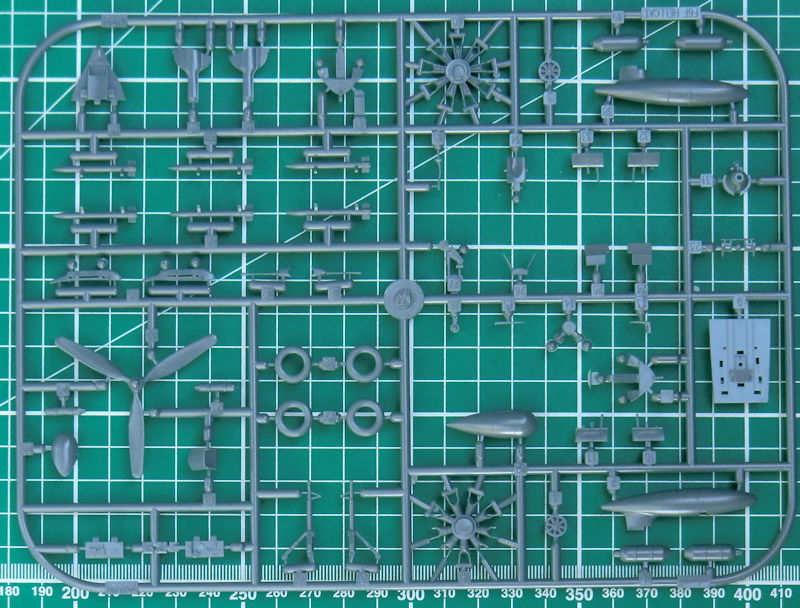 Der Motor besteht aus acht Bauteilen. Leider fehlt die Verkabelung. Diese gibt es nur als Fotoätzteil. Trotzdem kann so mit Hilfe von dünnem Draht ein schöner Motor entstehen.. Bei den Motorhauben gibt es Alternativteile Eine Kollektion Abwurfwaffen ergänzen den Bausatz.