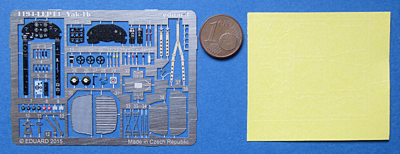 Der Bausatz enthält die Accurate Miniatures Spritzlinge für die Jak-1b. Dazu gibt es von Eduard Masken und farbig bedruckte Ätzteile. Beide sind von der bekannten Eduard-Qualität und den meisten Konkurrenten immer noch ein gutes Stück voraus. Die farbig bedruckten Fotoätzteile sind eine wertvolle Ergänzung für diesen Bausatz. Hauptsächlich der Cockpitbereich profitiert davon, aber auch Fahrwerksscheren und Kühlerdetails sind vorhanden. Leider befinden sich die Fahrwerksklappen auf dem separat zu erwerbenden Satz. Für den Bausatz gibt es übrigens jede Menge Zubehör zu kaufen, Räder, Auspuffstutzen, Landeklappen u.s.w. Die Bauanleitung ist auf hochwertigem Papier, allerdings nur in A5 Größe gedruckt. Die Baustufen sind aber sehr groß abegebildet, so dass dies überhaupt kein Problem ist. Etwas Vorsicht ist bei den Abbildungen der Bemalungsvarianten angeraten. Hier hat sich in der Vergangenheit schon mal der eine oder andere Fehler eingeschlichen.