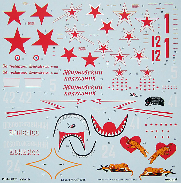 Bemalungen: Der Bausatz erlaubt die Darstellung von 7 Flugzeugen. Die Bemalungen sind farbig in der Bauanleitung dargestellt. Alle Farbangaben sind aus dem Gunze Farbensortiment - dessen Importeur Eduard für Tschechien ist. Die Abziehbilder sind von Cartograf glänzend gedruckt und zwar in jeder Hinsicht. Sogar silbern umrandete Sterne sind im Satz enthalten.