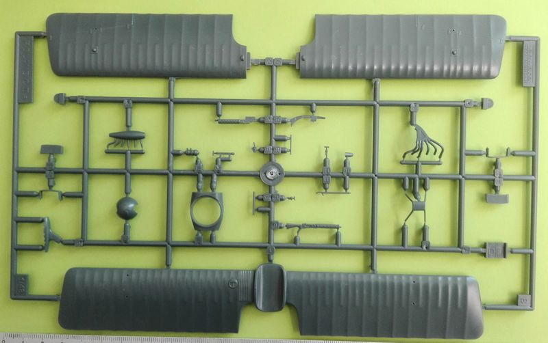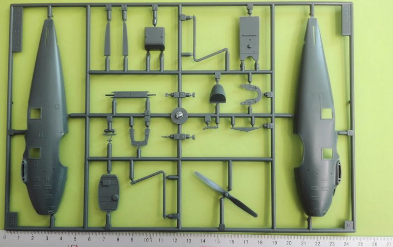 Bausatz: Im attraktiven Stülpkarton liegen drei graue und ein klarer Spritzling, zwei Ätzteilplatinen, Maskierfolie und zwei abziehbilderbögen. Die einzelnen Bauteile sind sehr detailreich ausgebildet und weisen keine Fehler auf. Selbst das Sitzpolster des Pilotensitzes liegt als eigenes Bauteil vor. Ebenso die Instrumententafel für das Cockpit. Mit den Ätzteilen (Messing und Neusilber) wird der Bausatz noch weiter aufgewertet.