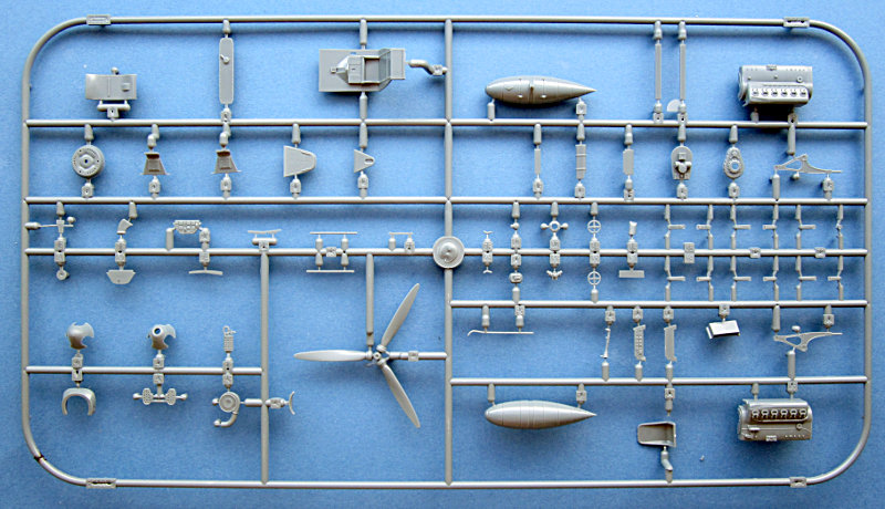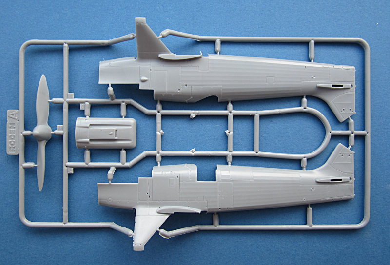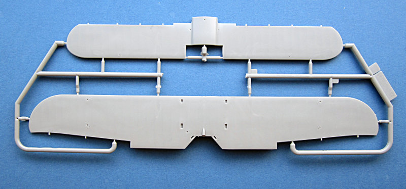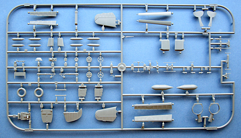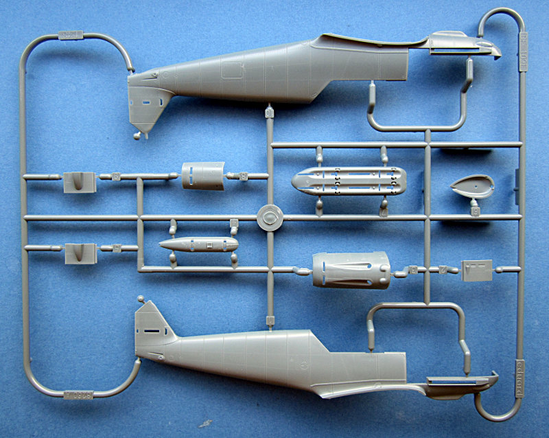In der bunten Verpackung von Eduard finden sich dieselben 5 graue und ein kleiner klarer Spritzling wioe bei Roden. Die Teile sind sauber abgespritzt, auch wenn es an den Formtrennstellen hier und da ein wenig Grat gibt. Auch hier gibt es ein paar Flussmarken in den Teilen. Diese sind aber noch weniger als beim Roden Kit und dort waren sie später nicht mehr sichtbar. Hier und da gibt es auch ein paar kleine Sinkstellen, aber nichts dramatisches. Die Passgenauigkeit ist brauchbar. Ich habe die Rumpfhälften den Unterflügel und den inneren Fahrwerkeinsatz angepasst und musste etwas schleifen und feilen, damit diese ineinander passten. Es sollte also in jedem Fall trocken angepasst werden. Die Lösung mit den halb am Rumpf angegossenen Fahwerksstrebenverkleidungen gefällt mir übrigens sehr gut, auch wenn so das Versäubern der Klebekanten etwas schwieriger ist.