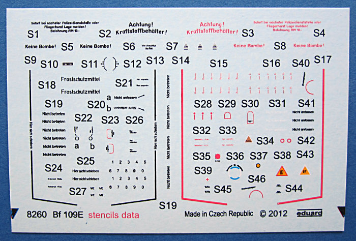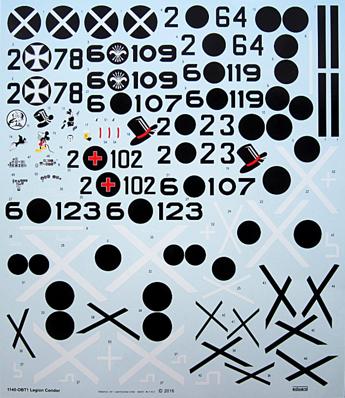 Bemalungen: Bei Eduard gibt es Markierungen für vier Bf 109E der Legion Condor. Abgebildet ist hier der gesamte Bogen von Cartograf mit allen Markierungen für beide Flugzeuge. Darüber hinaus gibt es noch Wartungshinweise von Eduard für die Bf 109.
