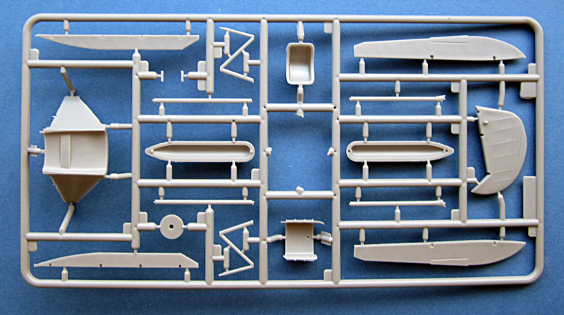 Spritzling E mit den Auspuffdüsen und den Kleinteilen für das Cockpit ist erstaunlich filigran und nahezu gratfrei. Leider hat es Roden verpasst, die Auspuffrohre hohl anzudeuten, was durchaus möglich gewesen wäre. Schwierig wird bei diesem Gießast das abtrennen der Teile sein. Ich empfehle dazu dringend den Einsatz eine PE- oder Rasierklingensäge. Die Trytool Scriber Saws von Hasegawa bieten sich dafür an. Mit dem Seitenschneider oder ähnlichen Werkzeugen wird es fast unweigerlich Bruch geben. Für das schon aus dem Plastikbausatz sehr schön detaillierte Cockpit gibt es hier natürlich weitere Details in Form von Fotoätzteilen. Der kleine Klarspritzling rundet den Bausatz ab und enthält den Winschutz und einen Scheinwerfer. Für einen verspannten Doppeldecker ist es sehr ungünstig, wenn im Bausatz bzw. der Bauanleitung kein Verspannplan enthalten ist. Dies ist das einzige wirkliche Manko des Original-Bausatzes. Eduard ist dies wohl auch etwas spät aufgefallen, so dass der Verspannungsplan als pdf über die Website abgerufen werden kann. Ich füge ihn hier (pdf) mal bei.