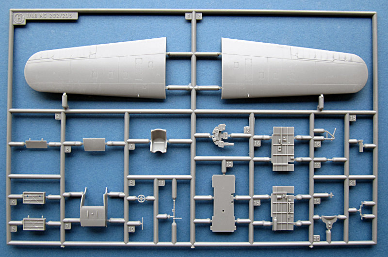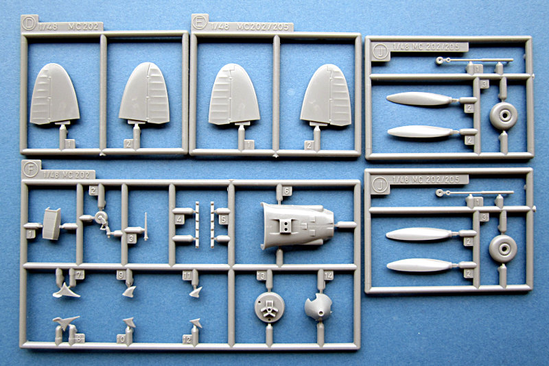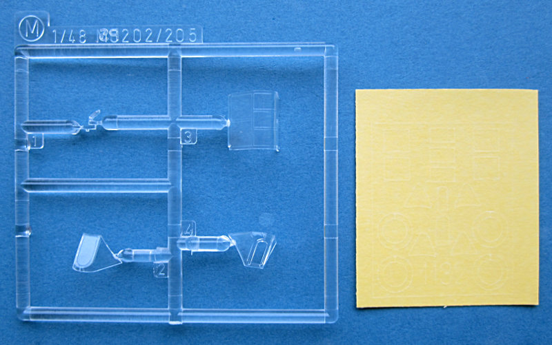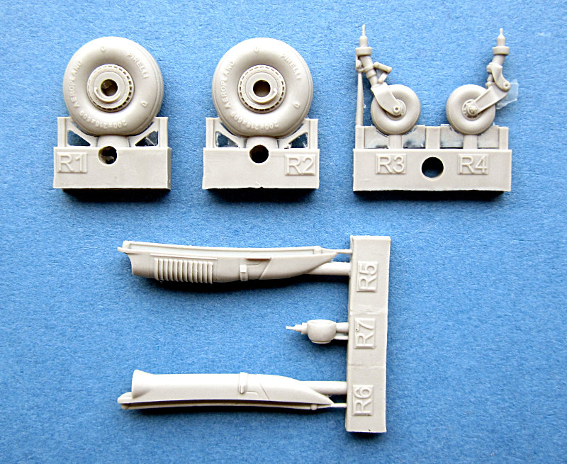 Allerdings sind auch einige Resinteile (Brassin) im Bausatz enthalten: zwei abgeplattete Hauptfahrwerksräder mit Rillenprofil, zwei verschiedene Spornräder und zwei Ladelufteinläufe - mit und ohne Sandabscheider. Die Reifen verfügen über erhabene Beschriftungen an den Flanken, was allemal besser ist, als die Auswerfermarken an den Bausatzteilen.