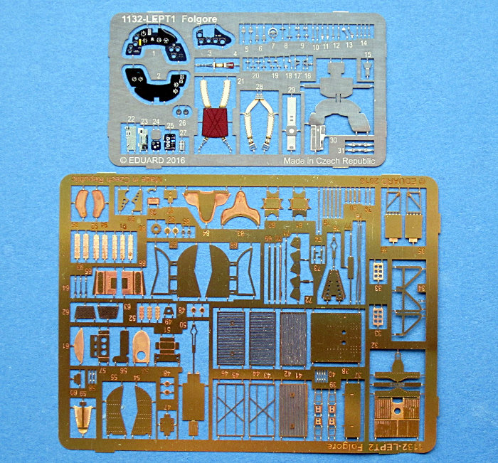 Eduard setzt hier natürlich mit den hauseigenen Mitteln an. Im Bausatz befinden sich eine kleine farbig bedruckte Platine und eine größere messingfarbene Platine, welche jede Menge Details für das Modell. Das Cockpit und das Fahrwerk profitieren am meisten von diesen Ätzteilen, allerdings bleibt der Fahrwerkschacht rudimentär, da Eduard hier ein eigenes Resinteil anbieten wird. Laut Ankündigung von Vladimir Schulz, war die Zeit etwas knapp für das Design dieser Teile und natürlich möchte man in Obrinice auch etwas Geld verdienen. Ähnliches gilt für die ebenfalls separat zu erwerbenden Auspuffstutzen.