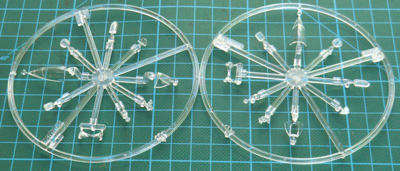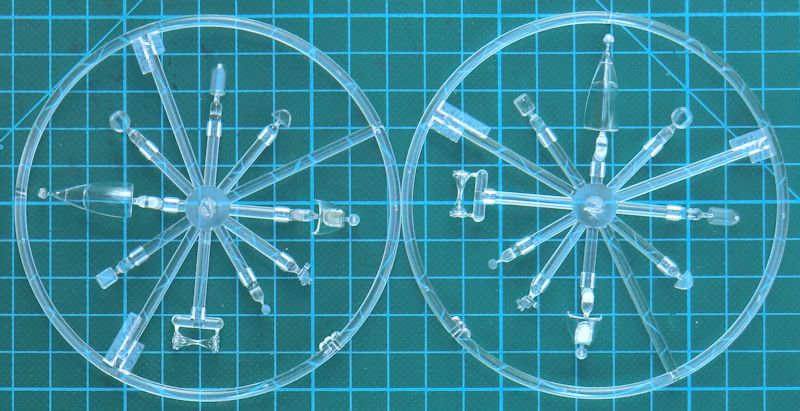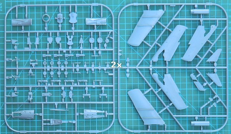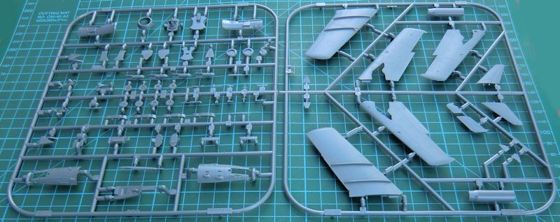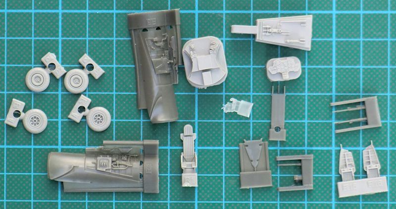 Bei den Tragflächen sind je nach Versionen Bohrungen anzubringen. Eduard liefert hier scharfe Hinterkanten. Gleiches gilt für die je zwei Hälften des Höhenleitwerks. Das Seitenruder ist ein einzelnes Teil. Im Bugbereich gibt es versionsspezifische Unterschiede. Beim Fahrwerk hat sich eduard Mühe gegeben. Die Schächte sind innen strukturiert und die Fahrwerksbeine schön detailliert. Bei den Rädern gibt auch Alternativteile aus Resin fürs Hauptfahrwerk. Für die Tragflächen gibt es unterschiedliche Zusatztanks.
