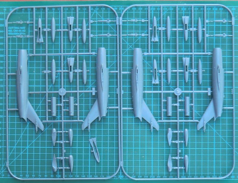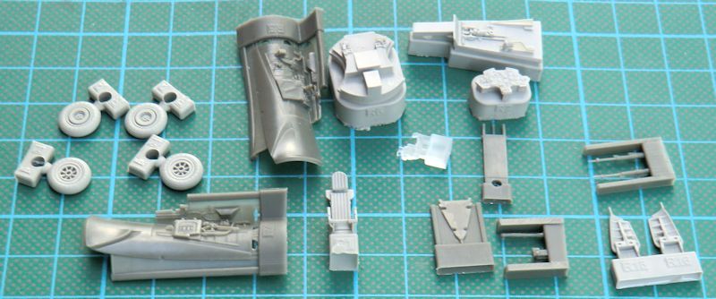 Aus diesen Teilen kann man zwei Modelle mit unterschiedlichen Detaillierunggraden fertigstellen. Die Resinteile fürs Cockpit und die aerodynamischen Bremsen liegen nur einmal bei. Gleichfalls gibt es vier Fotoätzteile nur einmal. Die Abspritzung sowie die Detaillierung sind voll auf der Höhe der Zeit. So gibt es feinste versenkte Strukturen, scharfe Hinterkanten und viele Details. Der Bau beginnt mit dem Cockpit. Hier hat man die Wahl zwischen Decals und Fotoätzteilen, die man für Instrumente benutzen kann. Für den aus zwei Teilen entstehenden Schleudersitz gibt es noch passende Gurte. Sehr gut gelöst hat eduard den Lufteinlauf. Hier kann man bis zum Triebwerk von beiden Seiten hineinschauen. Auf ein Buggewicht weist eduard hin.