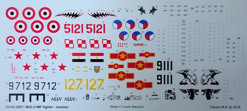 Bemalungsvarianten: Die umfangreichen Abziehbilderbögen sind sauber gedruckt. ES werden fünf farbig gedruckte Dekomöglichkeiten angeboten, die durch zwei Seiten für die Wartungshinweise ergänzt werden. Bei diesen ist aber zu beachten, dass sich ihre Anzahl im Laufe der Einsatzzeit am Flugzeug verringerte.