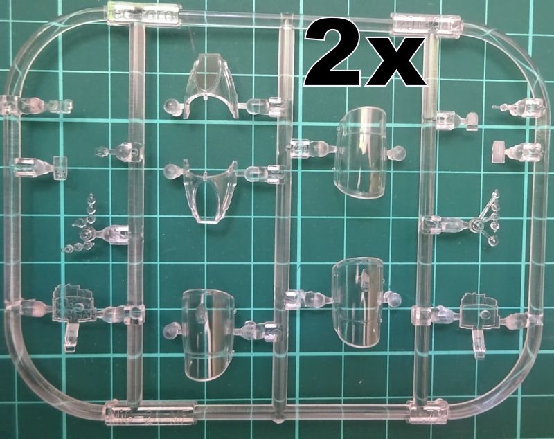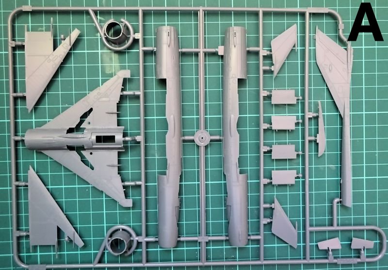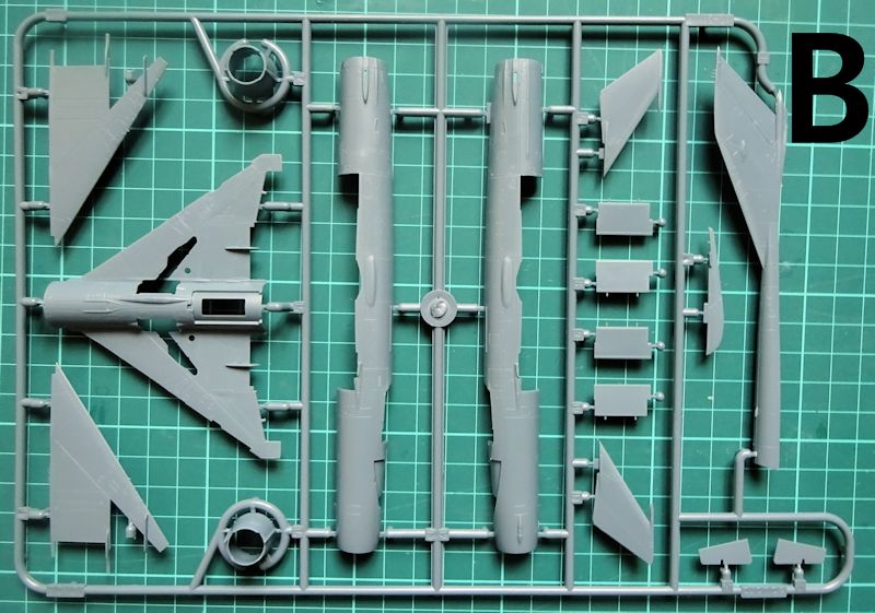 Nun zu den Großteilen. Alle zeichnen sich durch feine Oberflächengravuren aus. Bei den Tragflächen fällt die Abweichung von der vom 48er Modell bekannten Aufteilung ins Auge. Während sich mir der Sinn der Aussparung bei den Teilen 17/18 noch nicht erschließt, ist die Neugestaltung der Vorderkante eine super Idee und damit besser gelöst als bei der großen MiG. Die Kopplung der Landescheinwerfer mit den Druckbehältern in einem Klarsichtteil, ist auch zu begrüßen.