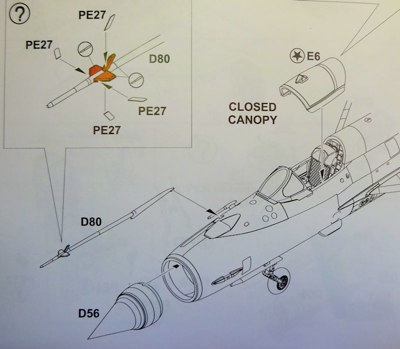 Die Wahl bei der Bestückung mit Außenlasten fällt schwer, da der Bausatz alle möglichen Zusatzbehälter enthält und bei der Bewaffnung kaum eine Option auslässt und im Gegensatz zum 48er auch die R-60 mitliefert. Allerdings wandern durch die Festlegung dieses ProfiPack auf den Abfangjäger alle Luft-Boden-Waffen in die Restekiste. Vier Seiten der Bauanleitung helfen bei der Gestaltung in diesem Bereich.