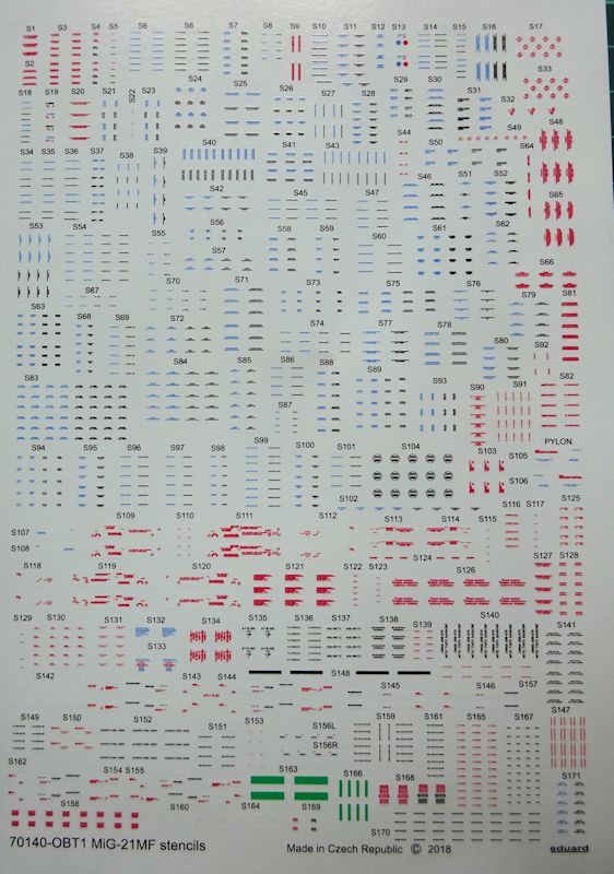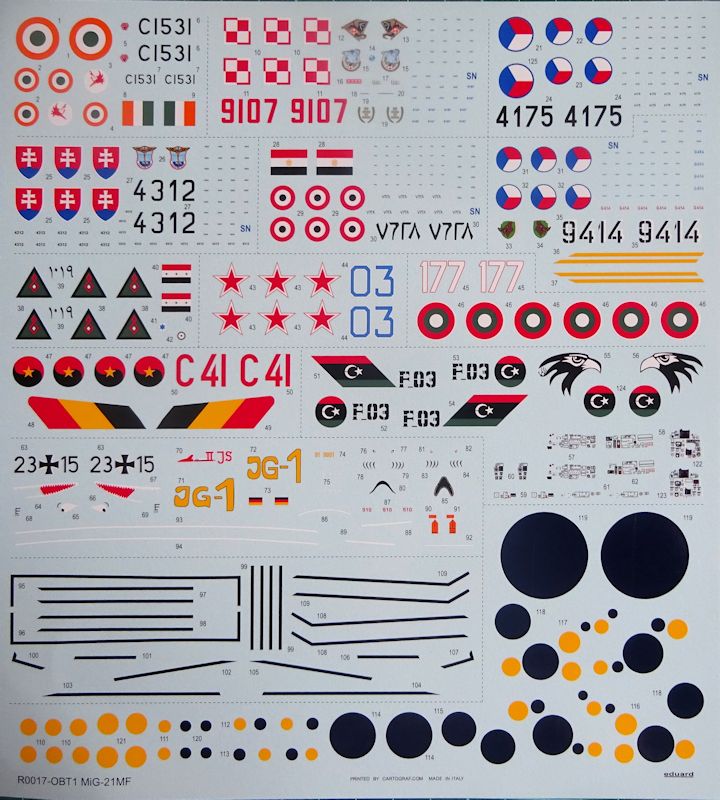 Bauanleitung/Bemalungsvarianten: Die Bauanleitung führt in Eduardmanier durch den Bau. Da hier in den einzelnen Bauschritten die unterschiedlichen Varianten gleichzeitig behandelt werden, ist ein sorgfältiges Studium der Anleitung unerlässlich um Fehler zu vermeiden. Für die Bemalungsvarianten wählte eduard eine hauseigene Nomenklatur und trennte die MiG-21 nach ihren Herstellerwerken Gorki und Moskau in Abfangjäger und Jagdbomber. In der Bauanleitung werden 12 farbig gedruckte Dekomöglichkeiten angeboten, drei der Gorki- und neun der Moskauvariante. Wer sich für das sowjetische Muster entscheidet (C), sollte berücksichtigen, dass dafür Teile von Ast A+B benötigt werden. D.h. es kann nur ein Modell gebaut werden.