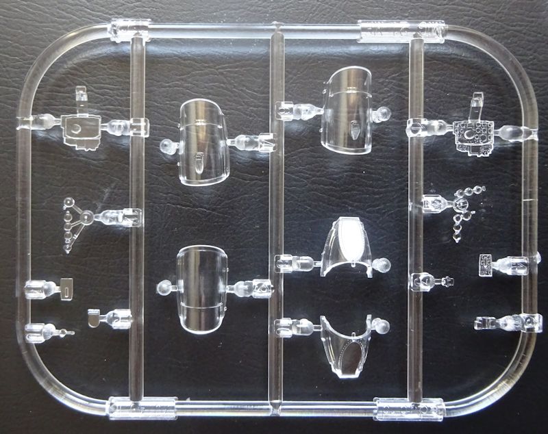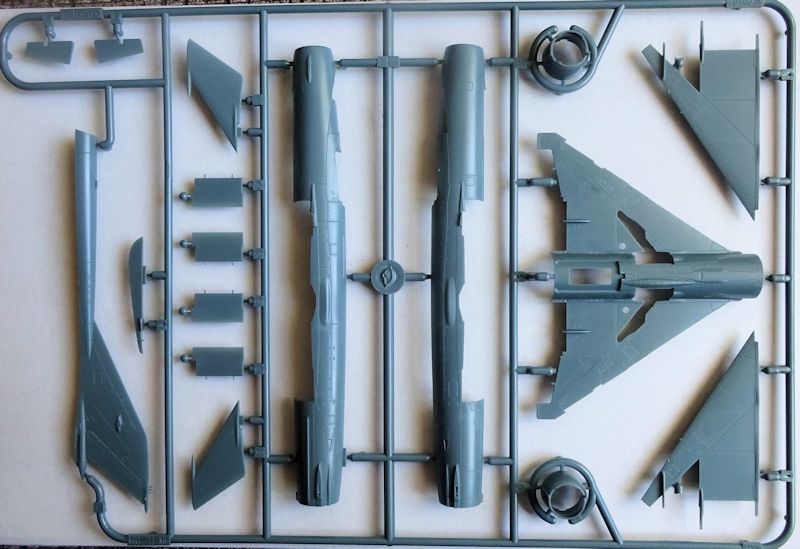 Nun zu den Großteilen. Alle zeichnen sich durch feine Oberflächengravuren aus. Bei den Tragflächen fällt die Abweichung von der vom 48er Modell bekannten Aufteilung ins Auge. Während sich mir der Sinn der Aussparung bei den Teilen 17/18 noch nicht erschließt, ist die Neugestaltung der Vorderkante eine super Idee und damit besser gelöst als bei der großen MiG. Lediglich der Spalt zwischen Rumpf- und Tragflächenbaugruppe ist etwas störend. Die Kopplung der Landescheinwerfer mit den Druckbehältern in einem Klarsichteil, ist auch zu begrüßen.