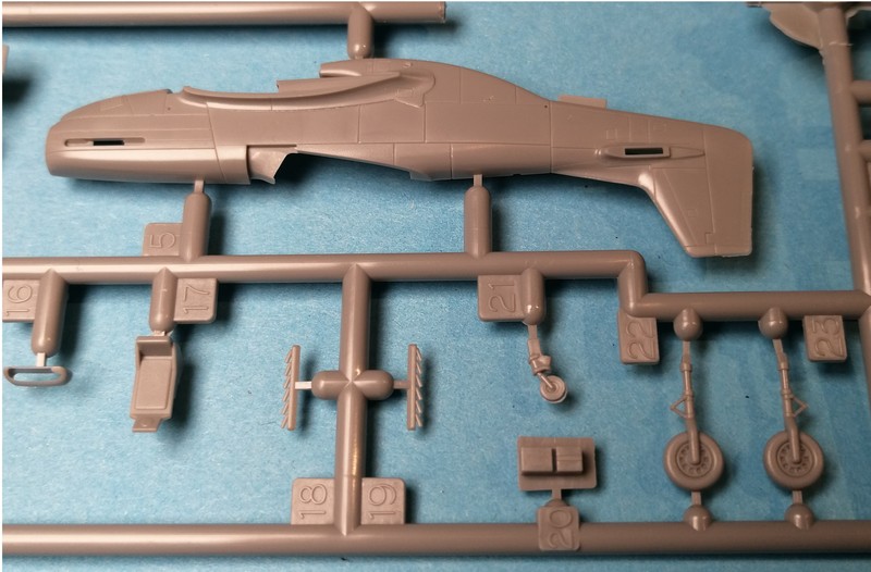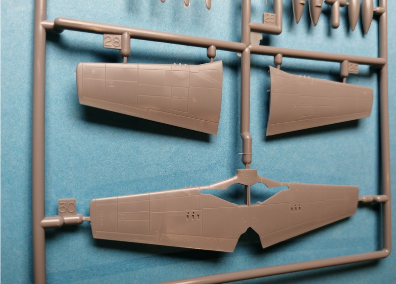 Das Cockpit ist recht einfach ausgestattet, aber an sich völlig ausreichend für den Maßstab. Zur Darstellung der Gurte sind Abziehbilder vorhanden. Wer mehr will, der findet im Programm des tschechischen Herstellers einen hauseigenen Ätzteilesatz. Die Hinterkante der Tragflächen ist zweiteilig, das Material ist aber sehr dünn. Damit sollte eine feine Kante am Ende entstehen. Die Hinterkanten des Seitenruders ist ebenfalls zweiteilig, während diese an den Höhenrudern einteilig ist. Sehr fein präsentieren sich auch die Fahrwerksteile und die Felgen. Die Reifen haben ein sehr feines Profil im Diamantmuster. Bei den Aussenlasten liegen "nur" die 75 Gallonen Zusatztanks bei. Der Propeller besteht aus separaten Blättern, Spinner und Grundplatte. Dies erleichtert die Lackierung, setzt aber etwas Sorgfalt bei der Montage voraus, damit alle Blätter am Ende den richtigen Anstellwinkel haben.