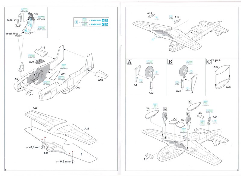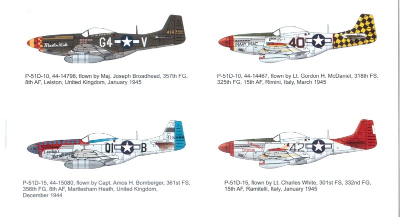 Die vier möglichen Optionen für die Bemalung werden in farbigen Zeichnungen mit umfangreichen Geschichten zur Maschine und Pilot dargestellt. Bei den ausgewählten Vorbildern sind klar Synergien in der Recherche mit den großen Bausätzen zu erkennen. So werden in den Zeichnungen auch die Papiertanks gezeigt, die sich nicht im Lieferumfang dieses Bausatzes befinden. Grundsätzlich sind es aber sehr interessante Maschinen, die hier ausgewählt wurden: