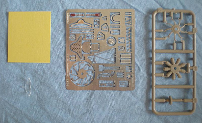 Der Karton präsentiert sich beim öffnen als sehr übersichtlich – 57 versch. Plastikteile in 3 Gussrahmen, ein durchsichtiges Plastikteil, 1 Fotoätzteilplatine mit 34 Teilen und 1 Maskierfolie für Räder + Windschutzscheibe sowie ein Decalsatz reichen völlig aus um eine Ni-17 bzw. Ni-23 anzufertigen. Die Gussäste waren sauber und gratfrei, die Decals ohne Versatz gedruckt und die Anleitung als überschaubar.