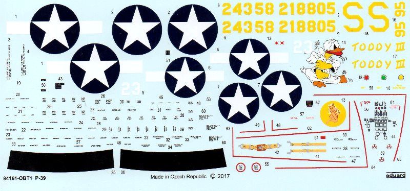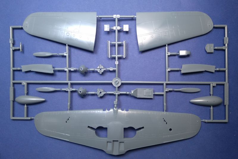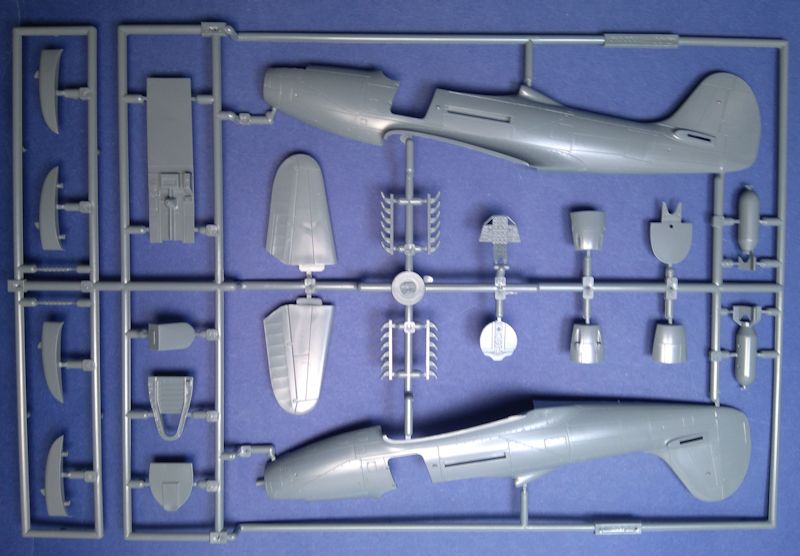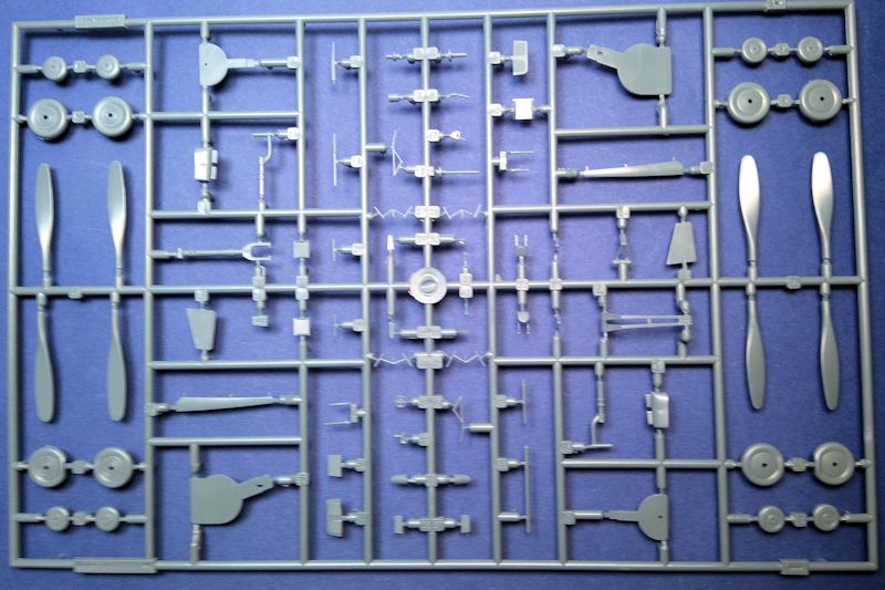 Rumpf und Flügel sind konventionell aufgebaut. Für die Auspuffrohre finden sich sowohl die sechsfache Ausführung als runde und Fishtail-Rohre und die runde 12-fache Ausführung für die P-400 Variante, obwohl die beiden letzteren nicht vorgesehen sind. Schaden tut es sicher nicht, die Restekiste bekommt Futter. Ebenfalls zur Auswahl stehen bei Eduard neben den "normalen" auch noch abgeflachte Reifen für Haupt- und Bugradfahrwerk, sowie drei verschiedene Propellerblatt-Typen und zwei Propeller-Naben. Damit ist es möglich einen Curtiss-Electric-Dreiblatt-Propeller für die P-39L, einen Aeroproducts-Dreiblattpropeller mit größerem Durchmesser für späte P-39N und sogar einen für eine P-39Q-21 mit Vierblattpropeller zu bauen, die erste und letztere Variante sind aber wiederum nicht vorgesehen.