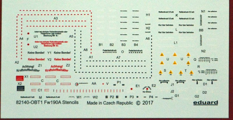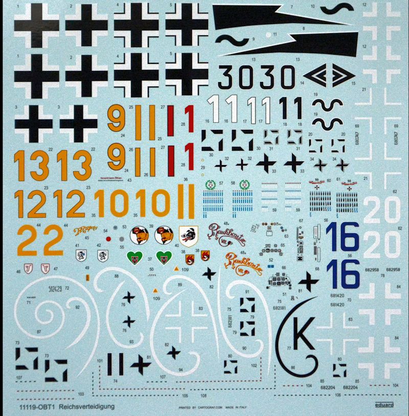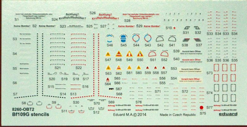 Der große Markierungsbogen ist sehr sauber gedruckt und enthält eine Auswahl von sechs Fw 190 und sieben Bf 109G. Dazu gibt es noch zwei kleinere Bögen mit Wartungs- und Warnhinweisen.