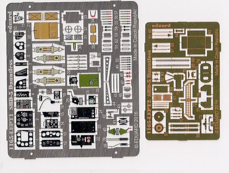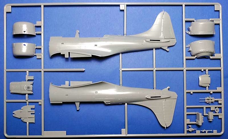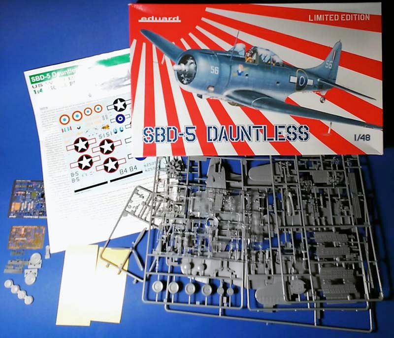 Bausatz: Mit dem vorliegenden Bausatz setzt Eduard seine Limited Edition Reihe fort. Auf der großen und stabilen Stülpbox prangt eine RNZAF Dauntless vor den Strahlen einer kaiserlich-japanischen Kriegsflagge. Als Grundlage dient diesmal der Accurate Miniatures-Bausatz von 1997, ergänzt durch Brassin-Resin- sowie Fotoätzteile und Maskierfolien aus Eduards eigener Produktion. Der Bausatz besteht aus sechs Gießrahmen mit 103 Teilen in einem hellen Blaugrau und einem Rahmen mit vierzehn Klarsichtteilen. Die Teile sind sauber abgespritzt haben allerdings einigen Grat, besonders an den Kleinteilen. Sinkstellen und nennenswerte Auswerfermarkierungen fallen nicht auf. Die Gravuren sind schmal und konsistent, einige Details sind erhaben dargestellt. Über die Passform des Bausatzes liest man im Netz verschiedene Meinungen und evtl. ist, auch wegen der Gussqualität, ein wenig Nacharbeit erforderlich. Zu einer Probepassung bin ich nicht gekommen.