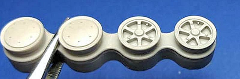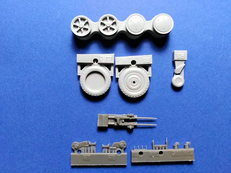 Die 15 Resinteile sind vor allem für das Fahrwerk und die Abwehrwaffen zu verbauen, die Resinräder haben separate, durchbrochene Felgen und ein ausgeprägtes Stollenprofil. Mit Hilfe von zwei Resinkappen lassen sich Räder mit abgedeckter Felge verwirklichen. Stollenprofile waren allerdings meist nur bei landgestützten Maschinen und eher selten auf Trägern in Gebrauch. Somit sind die Brassinräder nur für Banshees und einzelne späte Dauntless´ geeignet, hier benötigt man unbedingt genaue Vorbildfotos. Ein weiteres Highlight stellt der aus Resin und Ätzteilen zu erstellende hintere Abwehrstand dar.