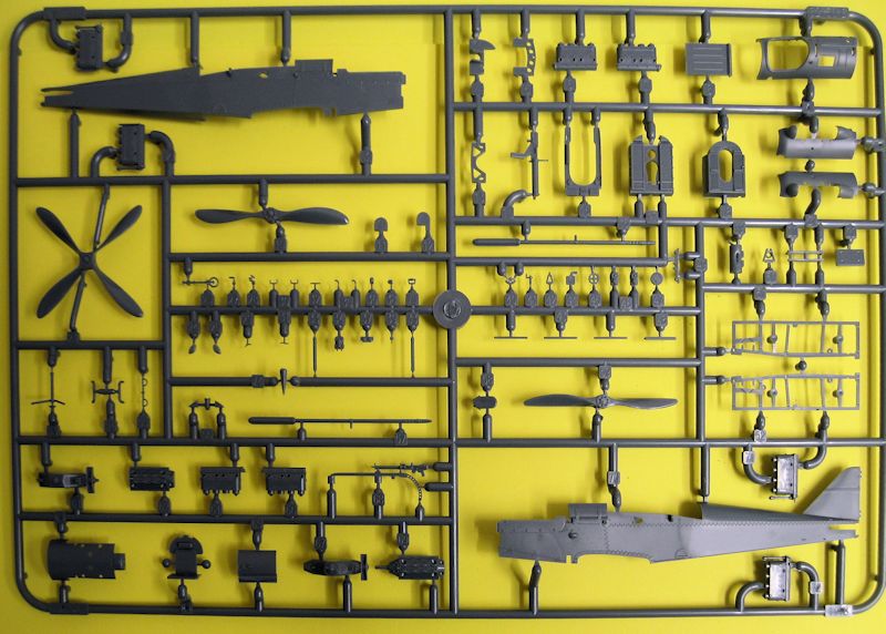 Der attraktiv gestaltete Stülpkarton beinhaltet zwei graue Spritzlinge mit 112 Teilen, einen klaren Spritzling mit 11 Teilen, eine Ätzteilplatine, Maskierfolie, Decals, Resinteile, und natürlich die Bauanleitung. Die einzelnen Teile sind sauber gespritzt, und haben einen für diesen Maßstab sehr hohen Detailierungsgrad. So sind z. Bsp. auf den Tragflächen die Bandagen über den Holmen incl. Nägel ausgearbeitet. Auch weisen die Teile nur wenige Auswerfermarken an nicht sichtbaren Stellen auf.