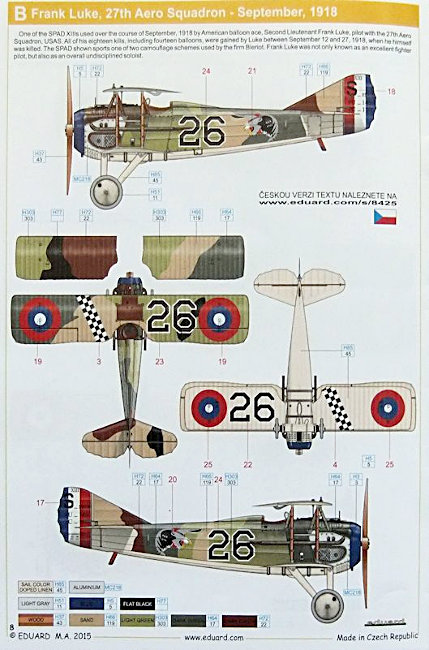 Bemalung: Die Maschine von Capitaine Rene Paul Fonk ist mit dem Storchenemblem der Escadrille SPA. 103 nicht weniger attraktiv als die 26 von Frank Luke mit dem amerikanischen Weißkopfseeadler an den Rumpfseiten.