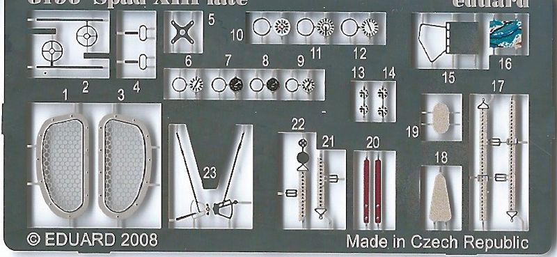 Somit erhält man auch weiterhin einen der besten Flugzeug Bausätze, der in diesem Maßstab angeboten wird, das absolut perfekt mit den veröffentlichten Maßstabszeichnungen übereinstimmt. Besonders die Stoffbespannung ist sehr überzeugend ausgeführt und auch auf kleinste Details wurde geachtet. Positiv anzumerken ist auch die maßstabsgetreue aber dennoch stabile Umsetzung der Flügelverstrebungen. Besonders positiv ist mir aufgefallen, dass bei den farbig bedruckten Ätzteilen neben diversen Instrumenten anzeigen auch eine kleine farbige Flugkarte enthalten ist, die man in einer passenden Halterungen im Cockpit verstauen kann. Die Aufteilung der Äste sieh t wie folgt aus: