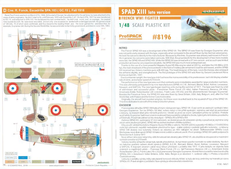 Vorbild: Basierend auf dem Design und den Erfahrungen mit dem Modell SPAD VII folgte 1917 das Modell SPAD XIII, wobei die Bewaffnung mit zwei Vickers MGs deutlich verstärkt wurde. Das neue Modell wurde im Frühjahr 1917 wegen produktionsbedingten Problemen allerdings nur in begrenzter Stückzahl ausgeliefert. Nach Überarbeitung des oberen Flügels konnte daher auch Ende 1917 die Vorgänger Version nicht vollständig ersetzt werden.