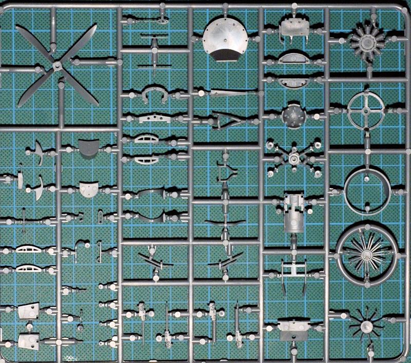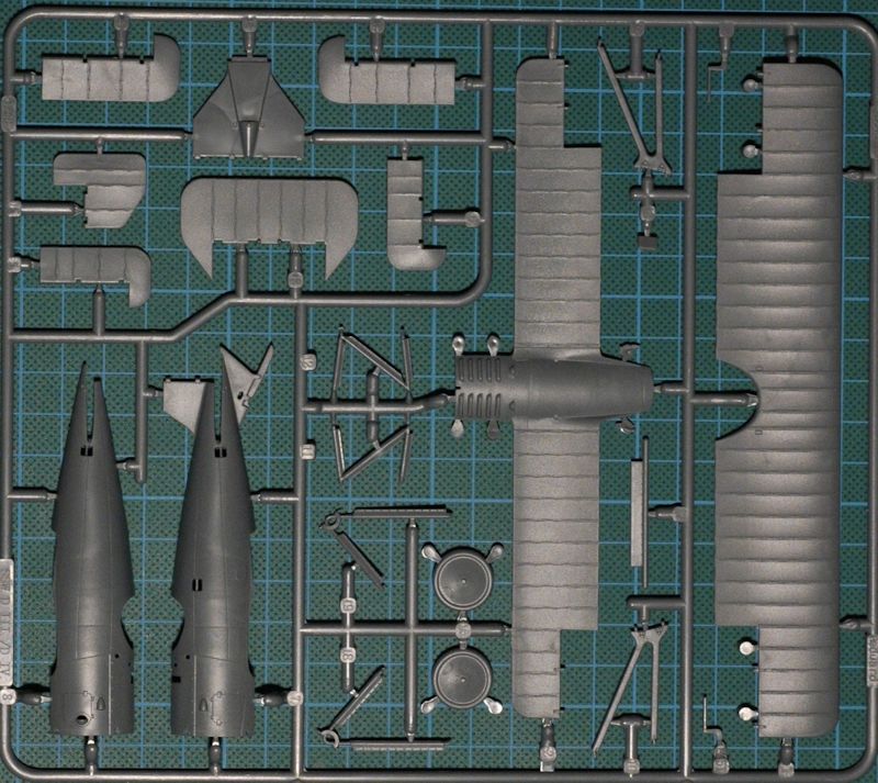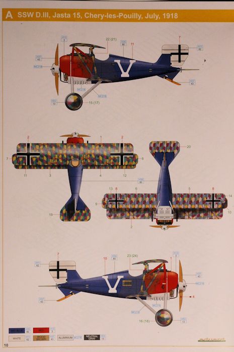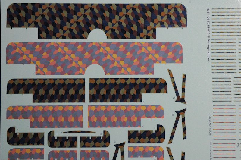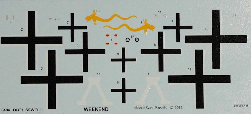 Bausatz: Der kleine Karton enthält die gewohnt guten Abspritzungen von Eduard. Zwei graue Gussrahmen mit 57 Teilen, ein Satz aus Plastik für zwei Glasscheiben und zwei verschieden große Bögen für die Abziehbilder. Die Teile erlauben wohl nur den Bau einer überarbeiteten SSW. D.III also mit unten offener Motorverkleidung.