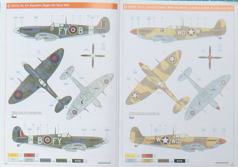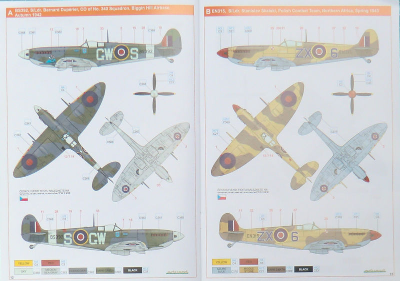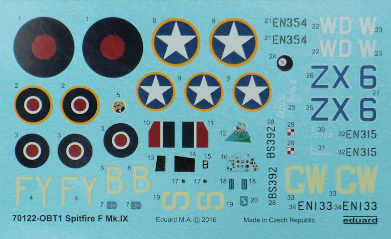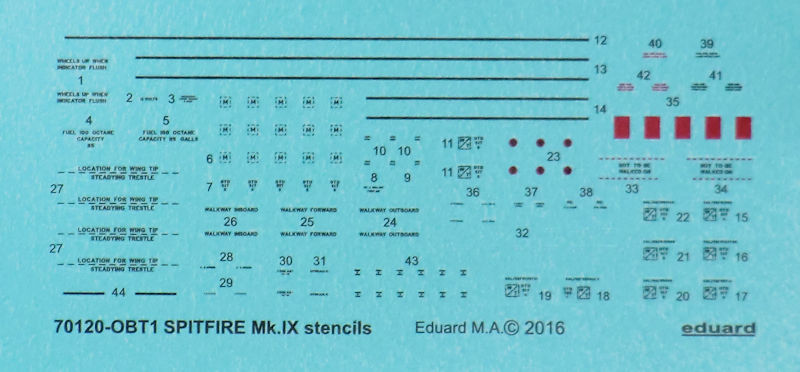 Die beiden Decalbögen sind tadellos im Register gedruckt. Es gibt scheinbar jeden Wartungshinweis der Spitfire. Bei den Farbangaben bezieht man sich auf das System von Gunze.