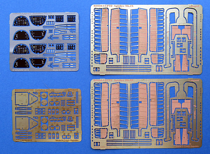Neben den Plastikteilen finden sich auch Fotoätzteile für verschiedene Instrumentenbretter bzw. Cockpitausstattungen und separat zwei Bögen für die Landeklappen des Modells. Diese waren am Boden meistens geschlossen, aber der Eine oder Andere wird sicher eine Spitfire mit offenen Landeklappen bauen wollen. Natürlich gibt es auch Masken für die Kabinenhaube und die Räder.