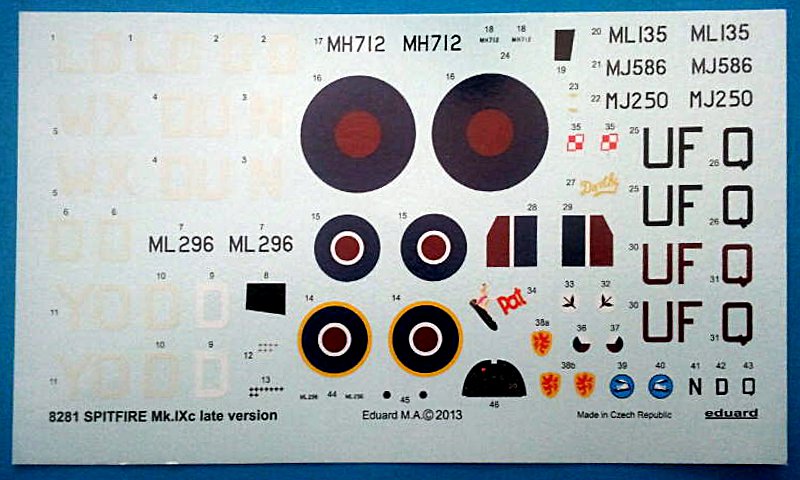 Der Decalbogen bietet wie bei Eduards Profi-Packs üblich fünf Versionen, diesmal plus Bonus, denn eine Maschine wird mit zwei Markierungen angeboten: