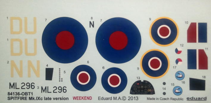 Der Decalbogen bietet wie bei Eduards Weekend-Editionen üblich nur eine Version, die Spitfire HF Mk. IXc, von Fliegerass F/Lt Otto Smik, No. 312 Squadron RAF, North Weald AB, August 1944. Die Maschine war in Dark Green/Ocean Grey über Medium Sea Grey mit Abzeichen in Sky getarnt. Als Farbsystem wird Gunze Mr. Color und Mr. Hobby Color angegeben.